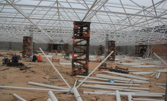 5)总体晋职法:此步履多使用在周边支护以及有多点支护的网架结构,可采取平板升降机、液压千斤顶等小型机具作业古交施工;