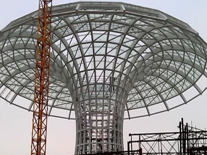 二、球形网架结构因其结构新颖,受力合理,自重轻、用钢量低等优点。如大型体育场馆球形古交螺栓球网架、公共场馆球形网架、电厂古交螺栓球网架、水泥工业球形网架、仓储物流球形网架、古交干煤棚工业球形网架、古交收费站古交加油站球形网架、展览中心、影剧院、商场、航站楼、候车厅、工厂古交车间、仓库、电视塔等球形螺栓球节点网架。国内球形网架结构主要分为:古交焊接球节点网架及螺栓球节点网架两种。螺栓球节点网架其构件工厂内加工量较大,现场安装便捷,适用于现场工期紧,古交施工条件、用电量受制约,网架形状复杂、古交杆件定位困难的异形结构。螺栓球节点球形网架系统基本由古交杆件、螺栓球、支撑支座等组成。按照节点形式可分为交叉古交桁架体系、四角锥体系、三角锥体系等。支撑方式多为固定支座支撑。对于大面积、大跨度及有特殊受力或伸缩要求的网架结构可采用橡胶支座、滑移支座、球铰支座等支撑形式,以满足结构自身的受力稳定、均衡,便于内力释放等设计要求。